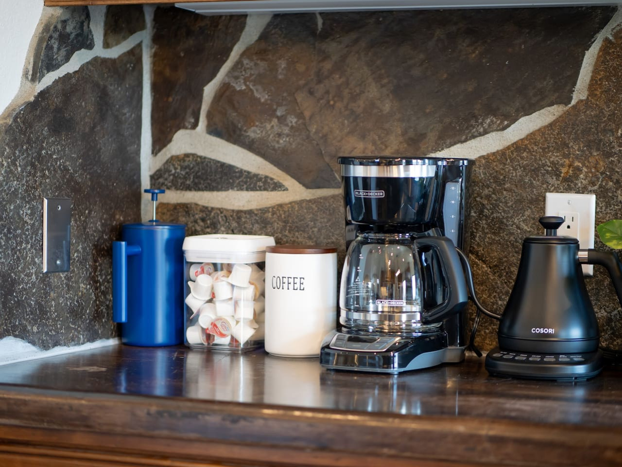 The kitchen also has a coffee bar that includes a coffee maker, French press, hot water kettle, and some ground coffee.