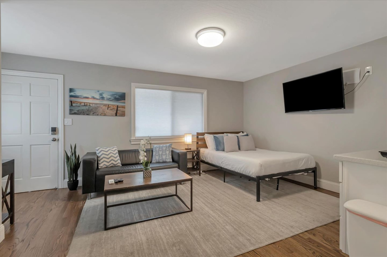 The studio has everything you need to be comfortable. A queen sized bed, TV, couch, small desk, closet, full bathroom and a kitchenette.