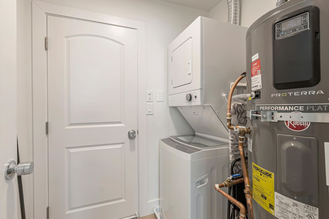 - Full kitchen with quartz countertops and high-end Whirlpool stainless appliances, including an oversized fridge, full stove, and dishwasher.