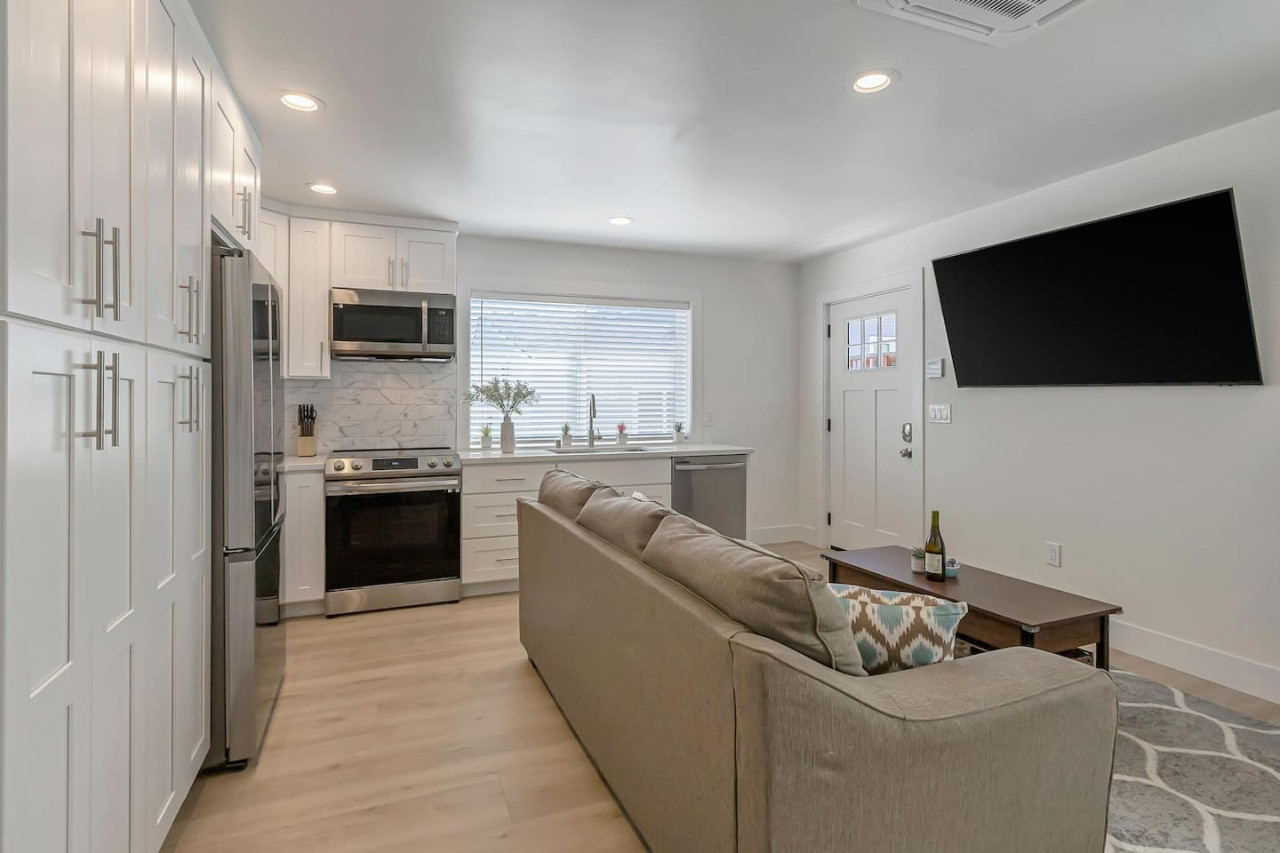 Our Studio is a special haven, tucked away 50 yards back from the street, offering a secluded and quiet retreat. Every detail has been carefully considered, from the full-sized high-end kitchen appliances to the furniture, bedding, cookware, towels, and hardwood floors. Oversized windows flood the space with natural light, creating a bright and inviting atmosphere.
